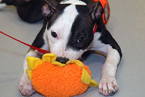 When playing with your puppy encourage non-contact forms of play. Grasp your dogs collar or drag line use a drag line if he is difficult to catch and walk him gently but decisively to his TO space. Dont roughhouse or wrestle because these forms of play encourage a.